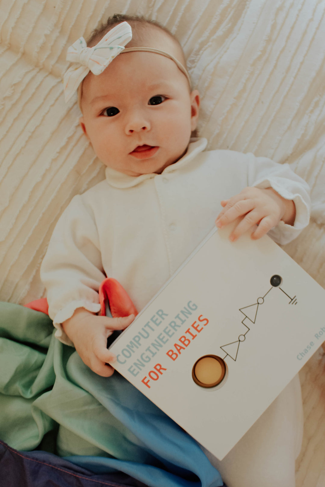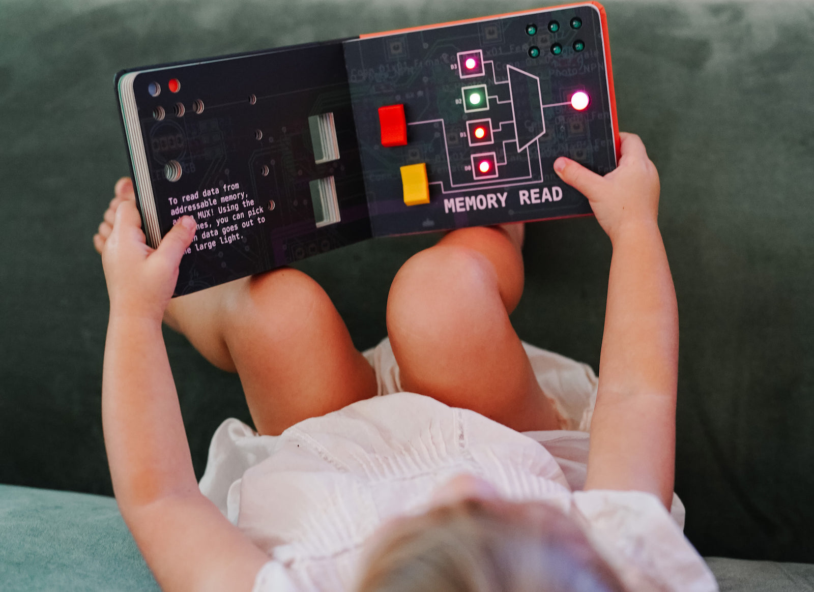 With two buttons and an LED, the original CE for Babies book explores basic computer logic gates, including NOT, OR, AND, XOR and a Latch. The book uses light sensors to detect which page is open and change the operands accordingly.